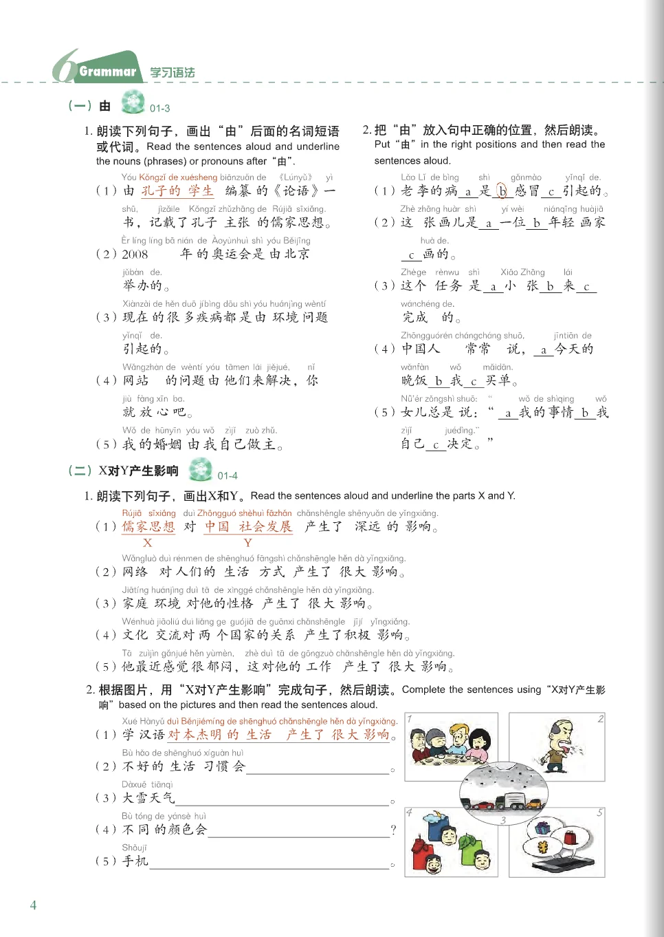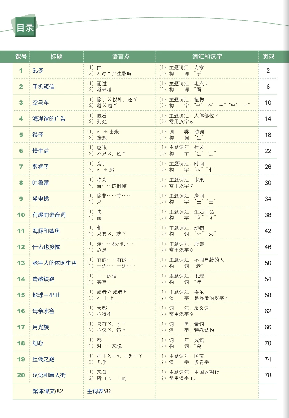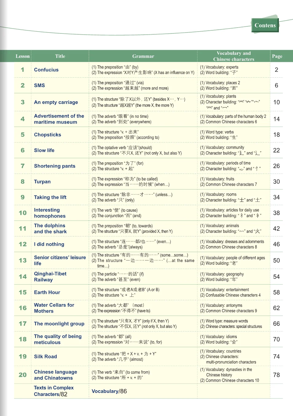 This is Textbook 4 in the series, suitable for adults who have finished studying New Concept Chinese (1-3) or have attained the equivalent Chinese proficiency. It has a total of 20 units, each with one lesson. It teaches about 600 common Chinese words, over 200 Chinese characters and 40 grammar points, encompassing topics that foreigners are mostly likely to encounter in their study, daily life and work. Having finished this volume, students’ Chinese proficiency will reach a level equivalent to Level 4 of the New HSK.