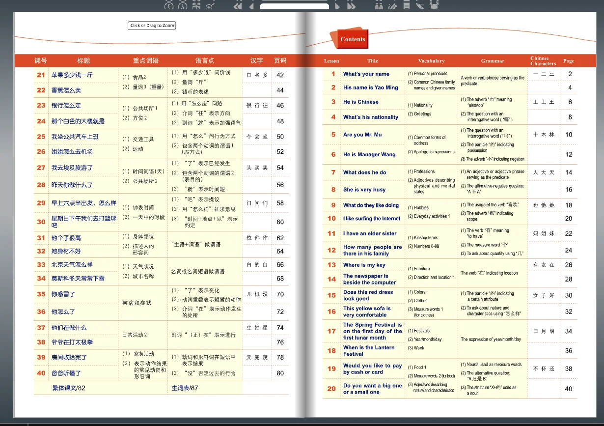 Repeated practice: There are altogether 20 units, each including a main lesson and a review one. The latter is a review of the key sentence patterns and words in the former, which will reappear and be reinforced repeatedly in later units too.