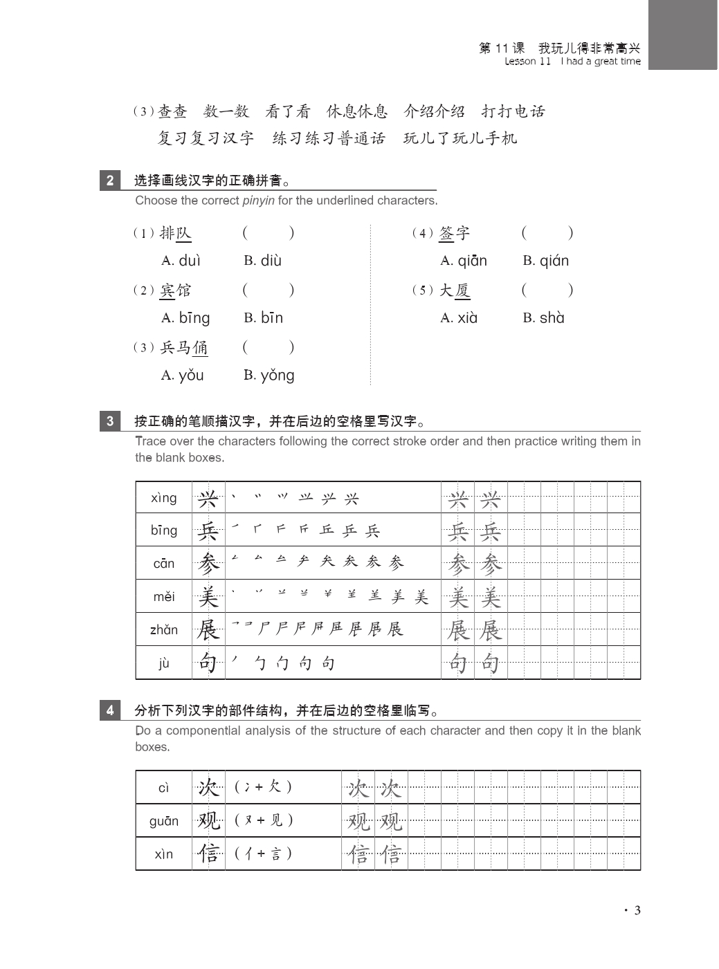 4) Strengthening practice and application The exercises are more clearly focused and centered on grammar points, each lesson providing exercises such as pronunciation drills, conversation practice, listening and repeating, reading comprehension, task and activity, writing practice, etc. to train comprehensive language skills and better handle the relations between mechanical, communicative, and task-based exercises.