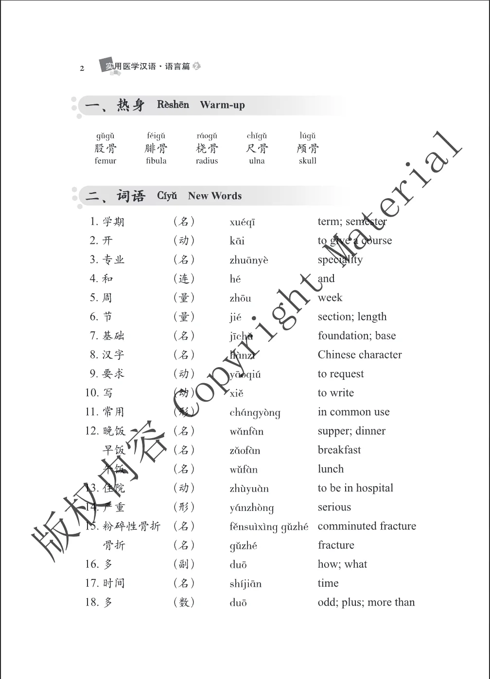 Practical Medical Chinese: Elementary is a series of language learning materials transiting from language knowledge to medical knowledge. It emphasizes the communicative competence of foreign students in daily social intercourse. Thus, when endeavoring to meet the language demands of foreign students, this book also concerns about their communicative competence in medical Chinese, helping them to learn the specialized knowledge in medical field and clinical practice. The presentation of medical knowledge is both progressive and practical.This is the second book of the series.