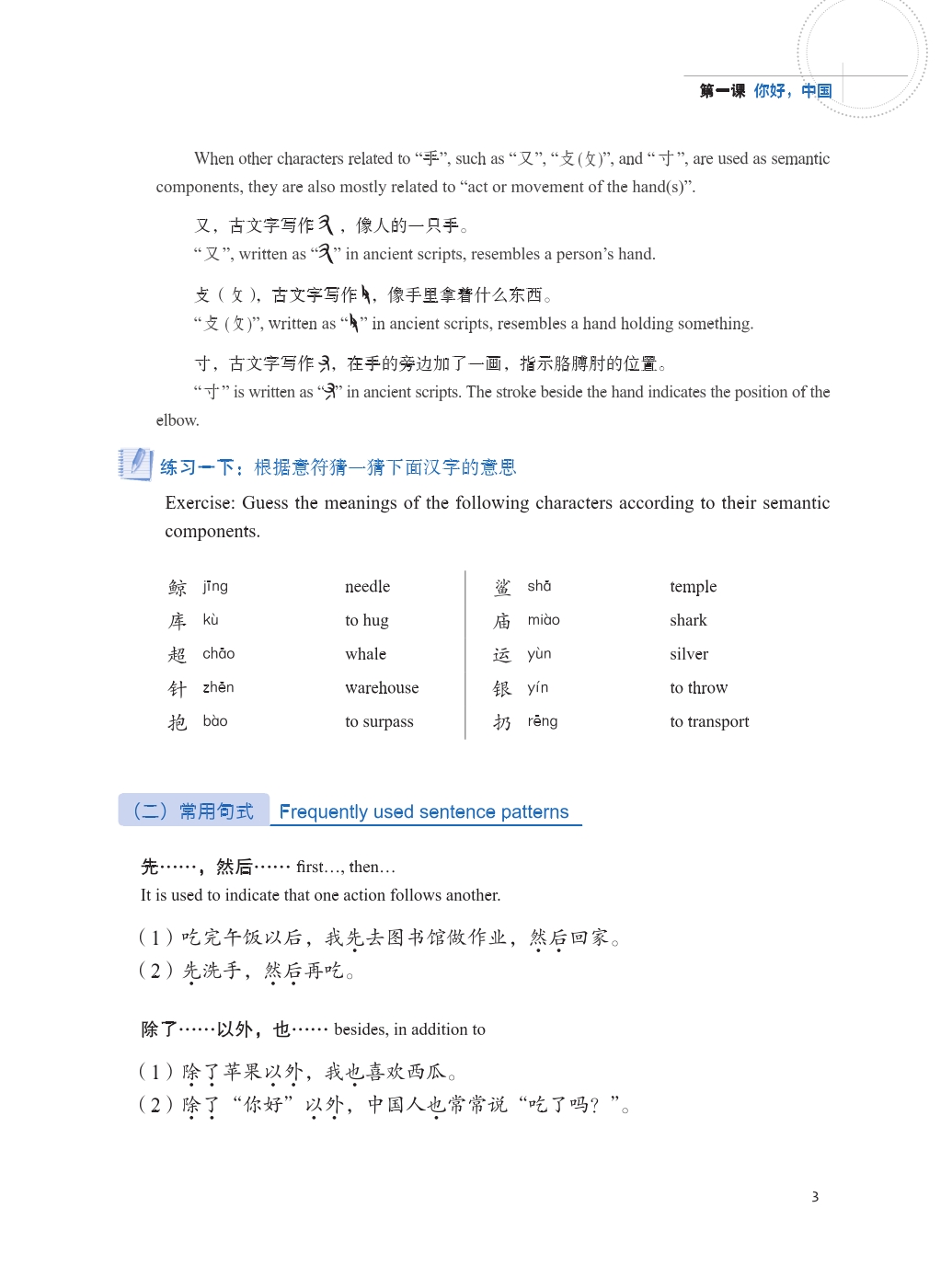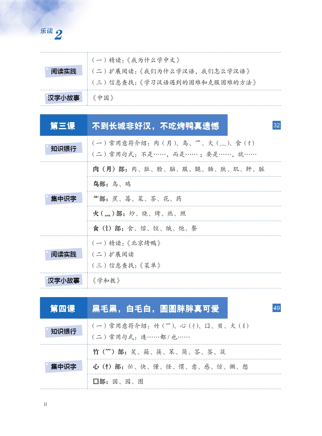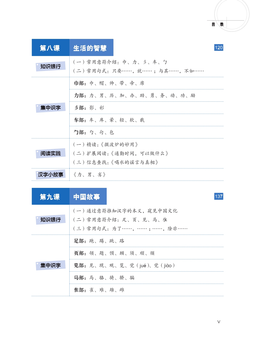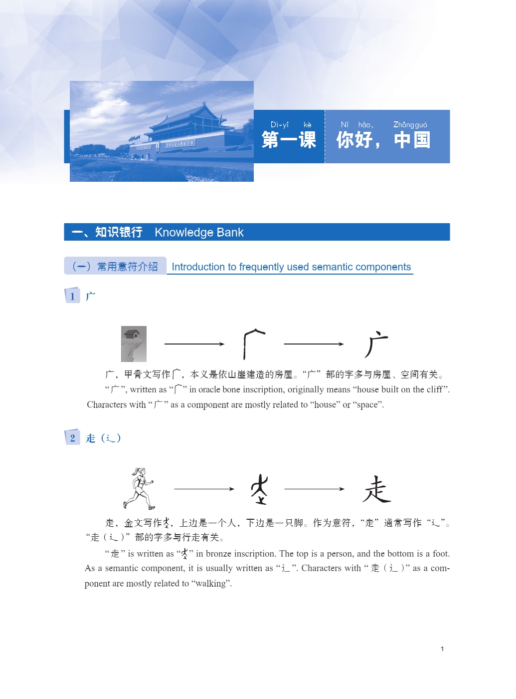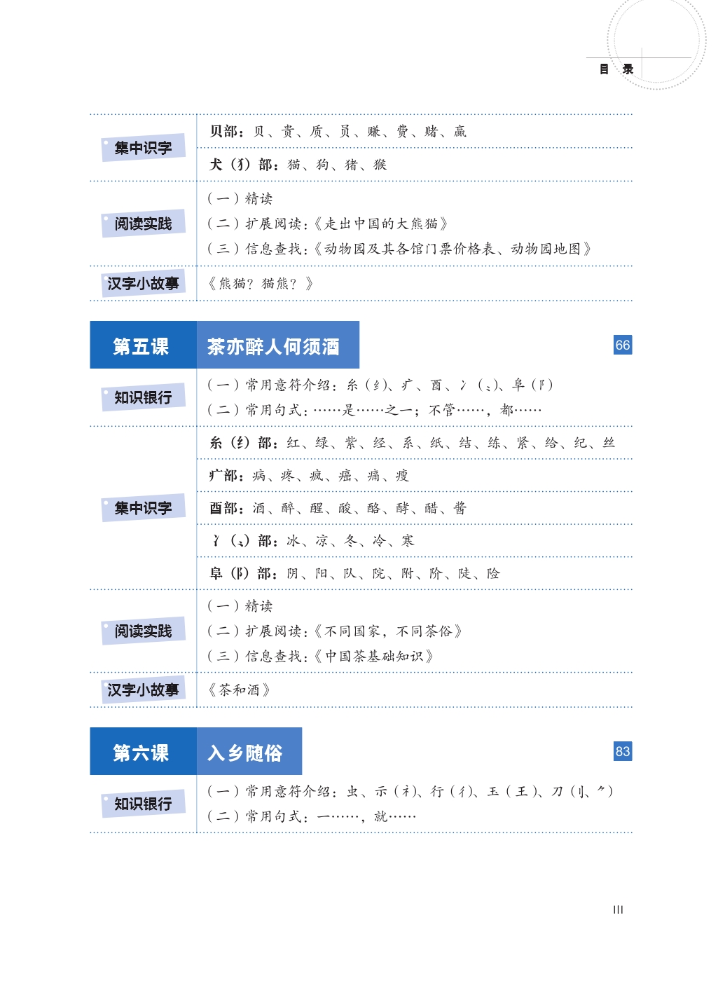 It is for both classroom use and self teaching. The recommended teaching time for each lesson is 2-4 class hours. This volume aims to develop students’ interest in reading and train their reading skills. It starts with the strokes of Chinese characters, concentrates on studying characters and enlarges vocabulary through the connection of semantic components, and then consolidates new words by reading sentences and paragraphs.