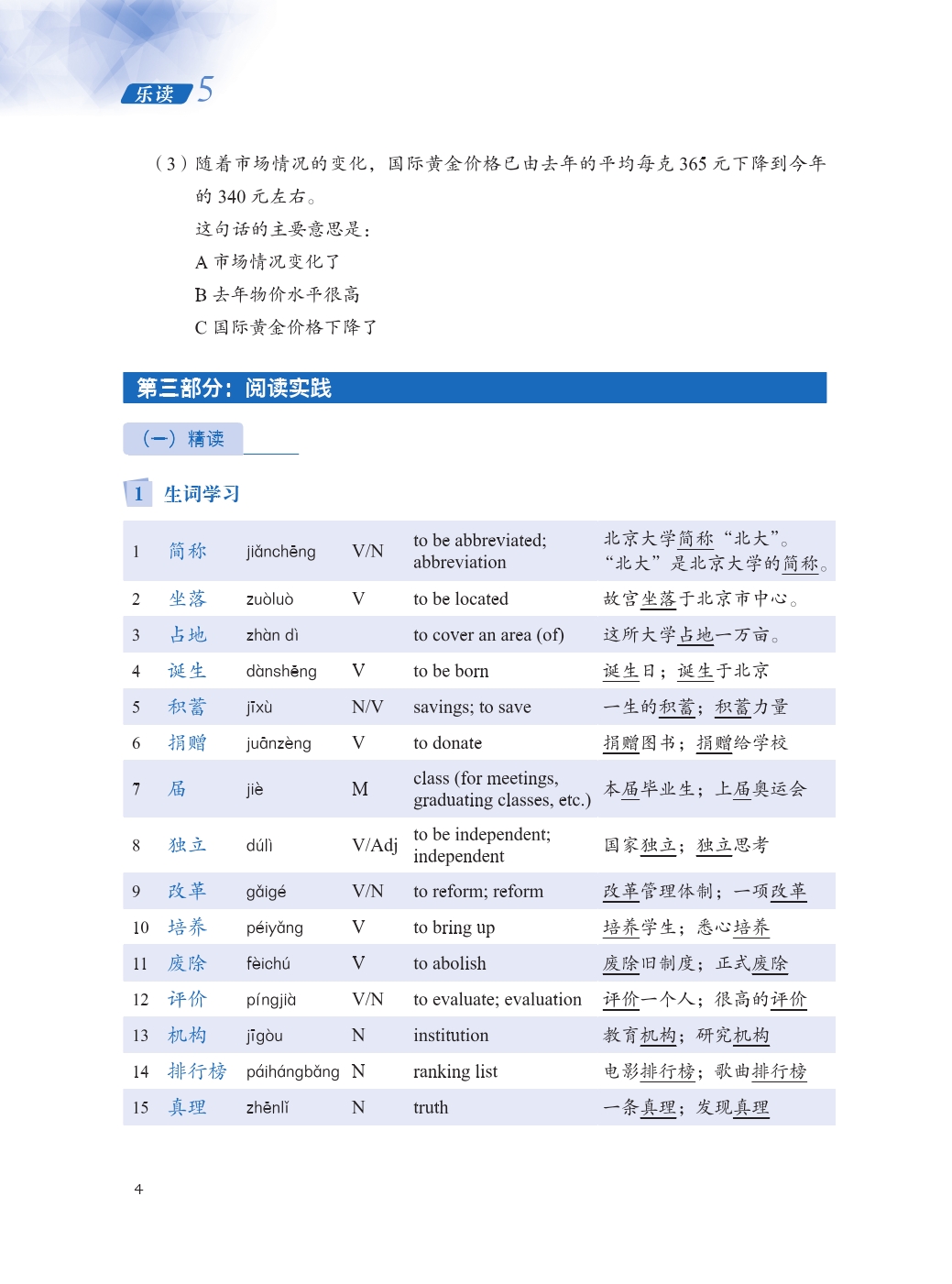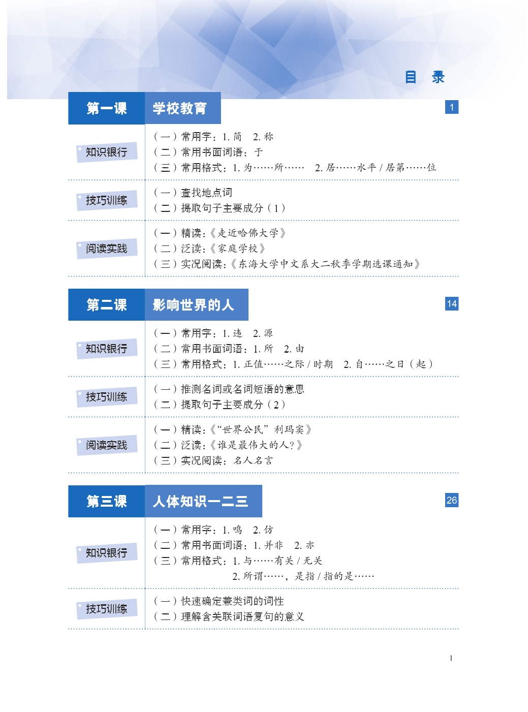 Targeted at the training of reading skills of Chinese learners, this book is designed and compiled for the difficulties in Chinese reading for Chinese learners and the need to improve their reading skills, highlighting the characteristics of reading textbooks, and helping students improve their Chinese reading skills through specific training. It provides abundant useful learning and practice materials to improve learners' reading skills and develop teachers' reading skills training.
