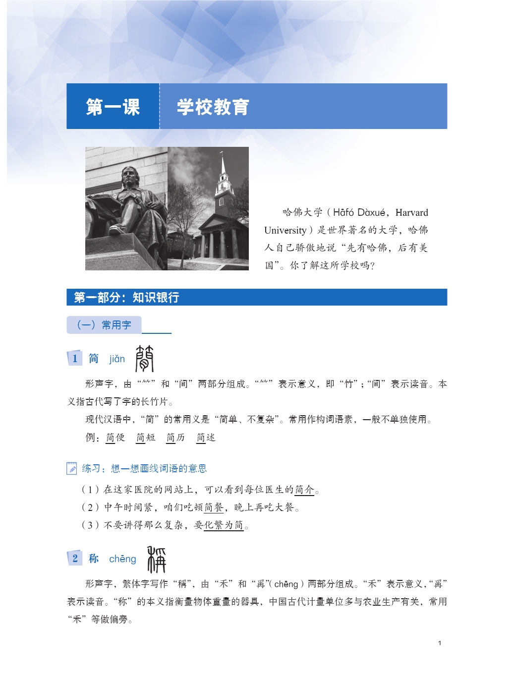 It is for both classroom use and self teaching. The recommended teaching time for each lesson is 2-4 class hours. This volume aims to develop students’ interest in reading and train their reading skills. It starts with the strokes of Chinese characters, concentrates on studying characters and enlarges vocabulary through the connection of semantic components, and then consolidates new words by reading sentences and paragraphs.