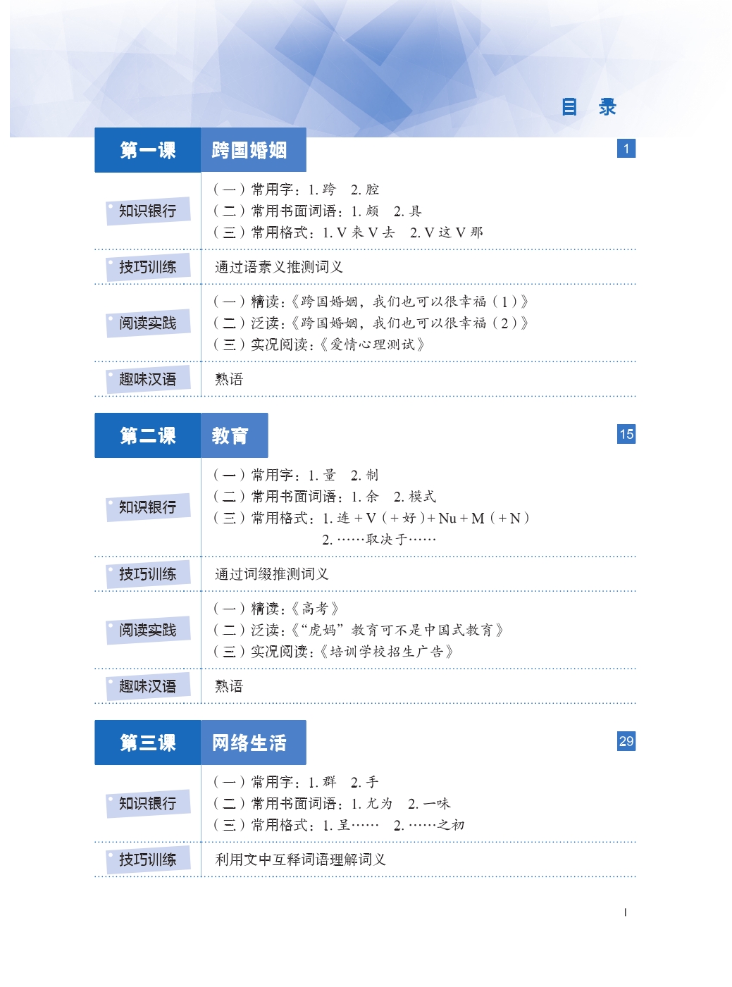 It is for both classroom use and self teaching. The recommended teaching time for each lesson is 2-4 class hours. This volume aims to develop students’ interest in reading and train their reading skills. It starts with the strokes of Chinese characters, concentrates on studying characters and enlarges vocabulary through the connection of semantic components, and then consolidates new words by reading sentences and paragraphs.