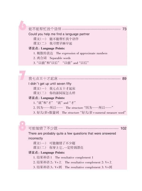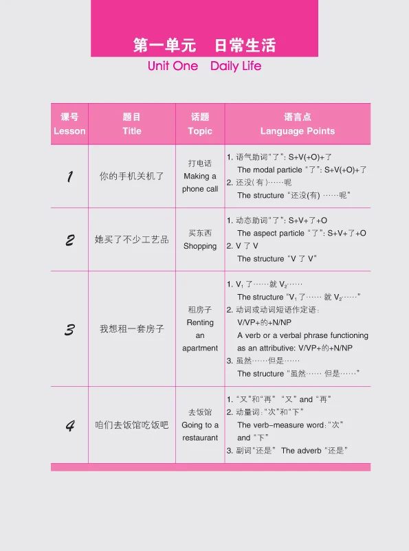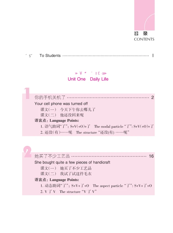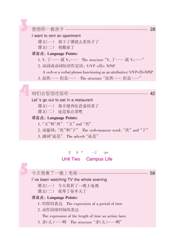 It consists of two volumes, each of which consists of 3 units. Each unit is composed of 4 lessons, all of which center around one topic. The topics are all the students familiar with and interested in when they study in China, including daily life, campus life, transportation and travel, entertainment and culture etc. The students will be able to learn over 600 Chinese words after learning these two volumes and further improve their listening, speaking, reading and writing skills.