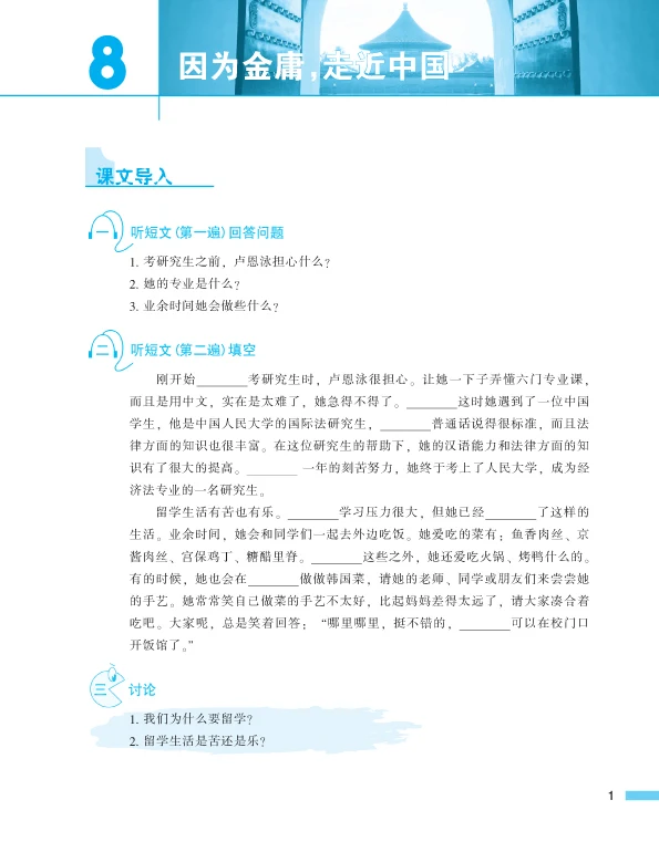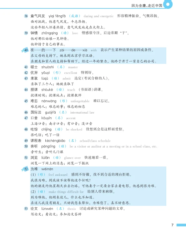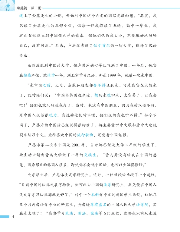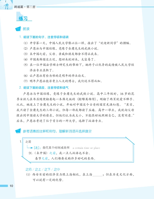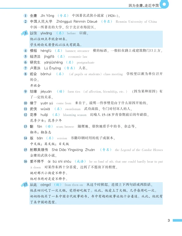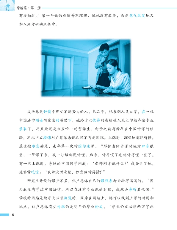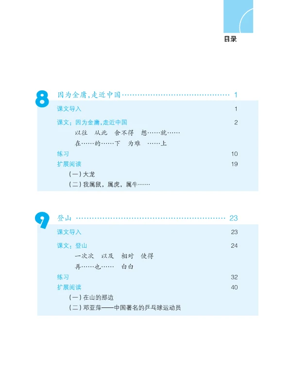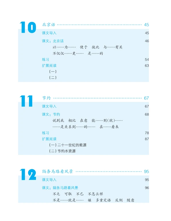 This is the second volume of Intermediate. Its contents involve many aspects such as studying abroad, extreme sports, dialect, environmental protection, feelings, family, drop-out children etc. The genres of the selected articles include prose, interview, miscellany etc. The students can learn 550 new words, 50 key words or grammar, 20 commonly-used morphemes and more than 80 relevant words, 20 sets of synonym discriminations and 34 idioms.
