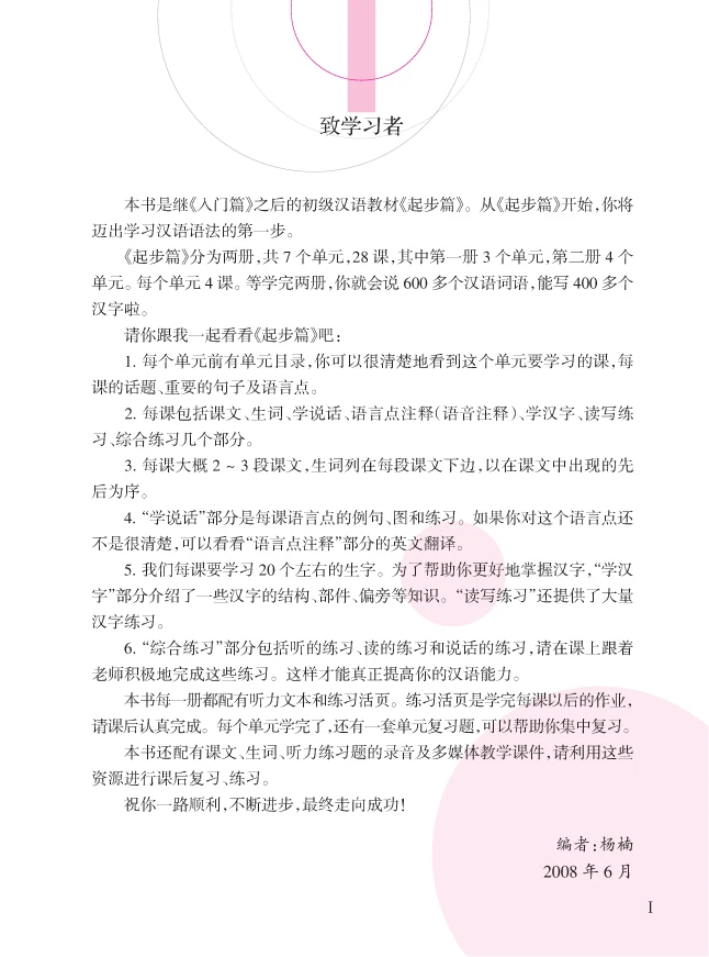 It consists of two volumes, the first of which covers three units and the second covers four. Each unit is composed of 4 lessons. There are altogether 28 lessons. After learning the two volumes, the students will be able to speak more than 600 Chinese words and expressions and write over 400 Chinese characters.