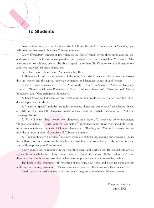 Lower Elementary, following Threshold of Road to Success, is the first step for the students to study Chinese grammar.