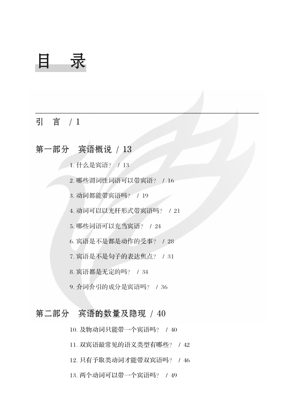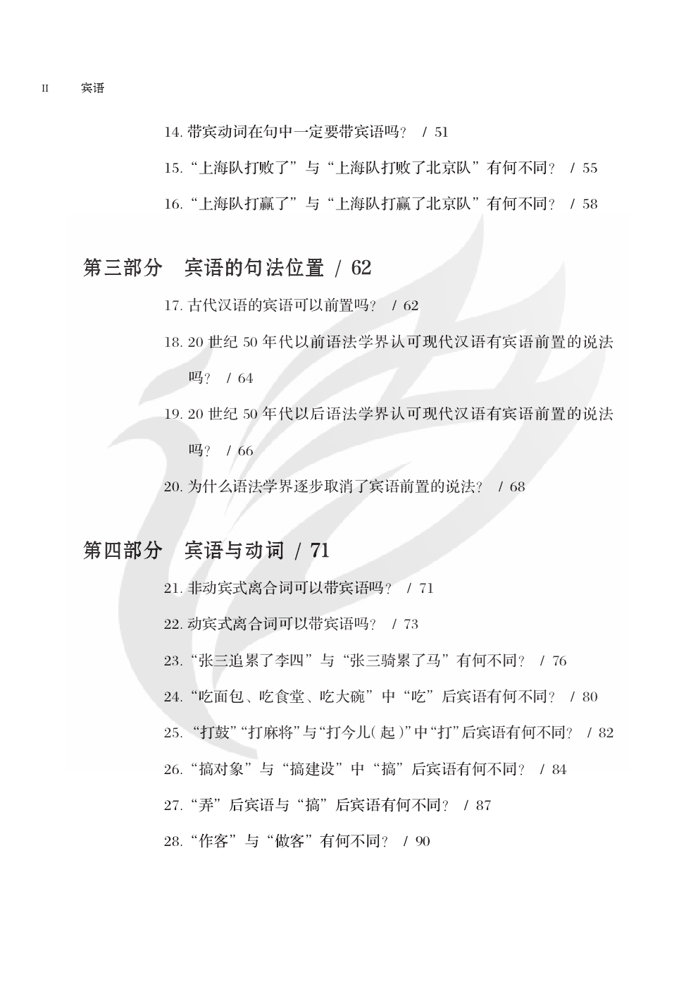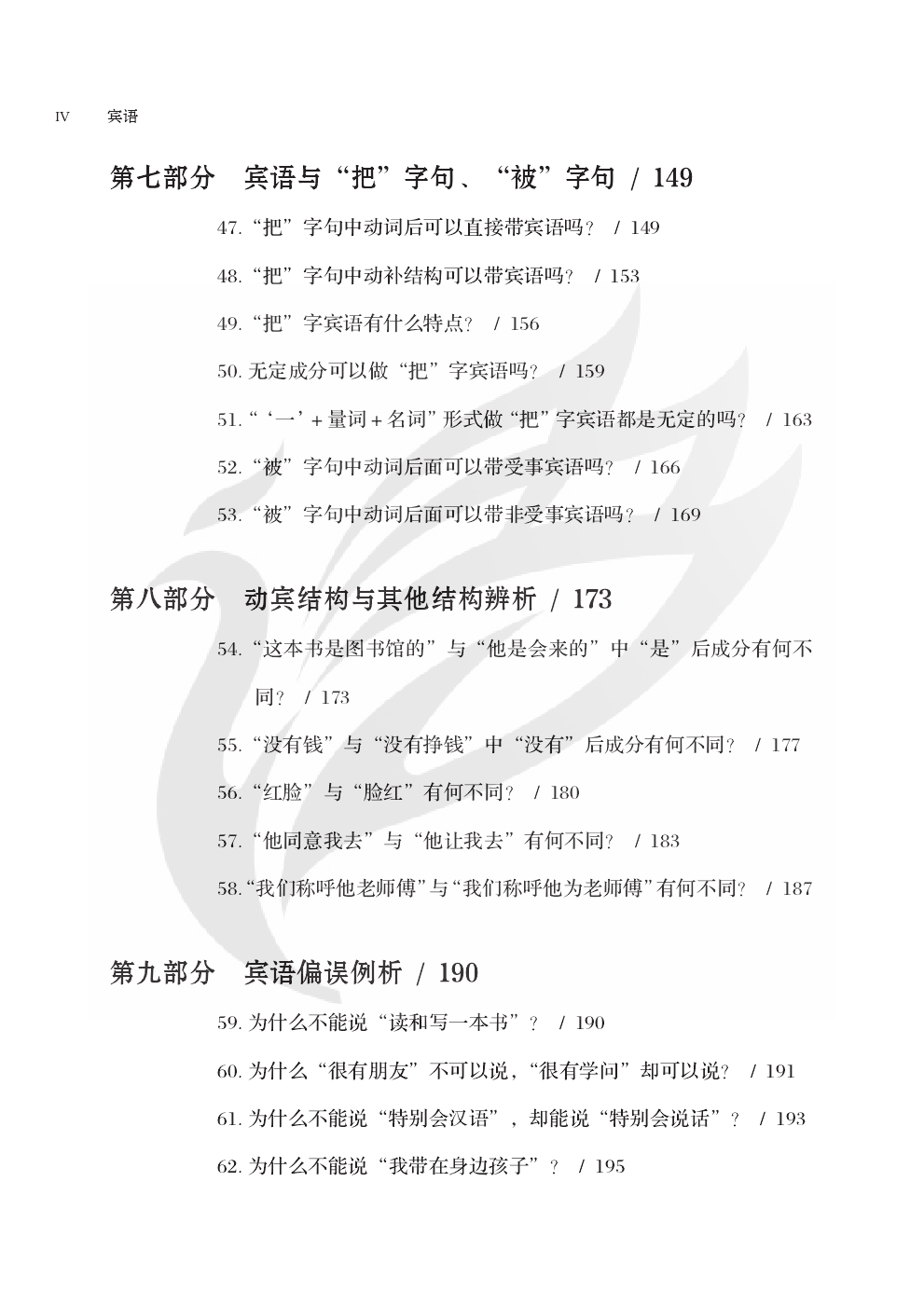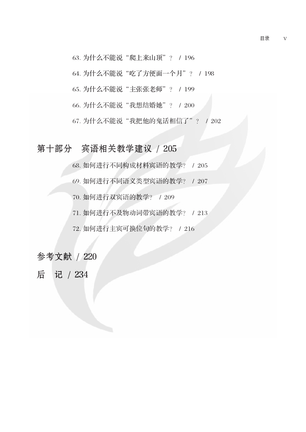 The traditional syntax puts “subject-predicate-object” together which shows the importance of the object as a syntactic constituent. It can be perceived as an important issue in the study of teaching Chinese as a foreign language for its complex semantic identity and uncertain syntactic position. Focusing on the object, this book targets the problems in teaching Chinese as a foreign language from the ontology. This book designs a total of 72 questions, which can be divided into 10 parts, discusses the basic concepts related to the object, the number and invisibility of the object, the relationship between the object and other syntactic constituents such as the subject, as well as the relationship with related syntactic patterns such as “把”-sentence, etc., analyses the causes of some typical object bias problems, and give examples of teaching suggestions for object-related problems.