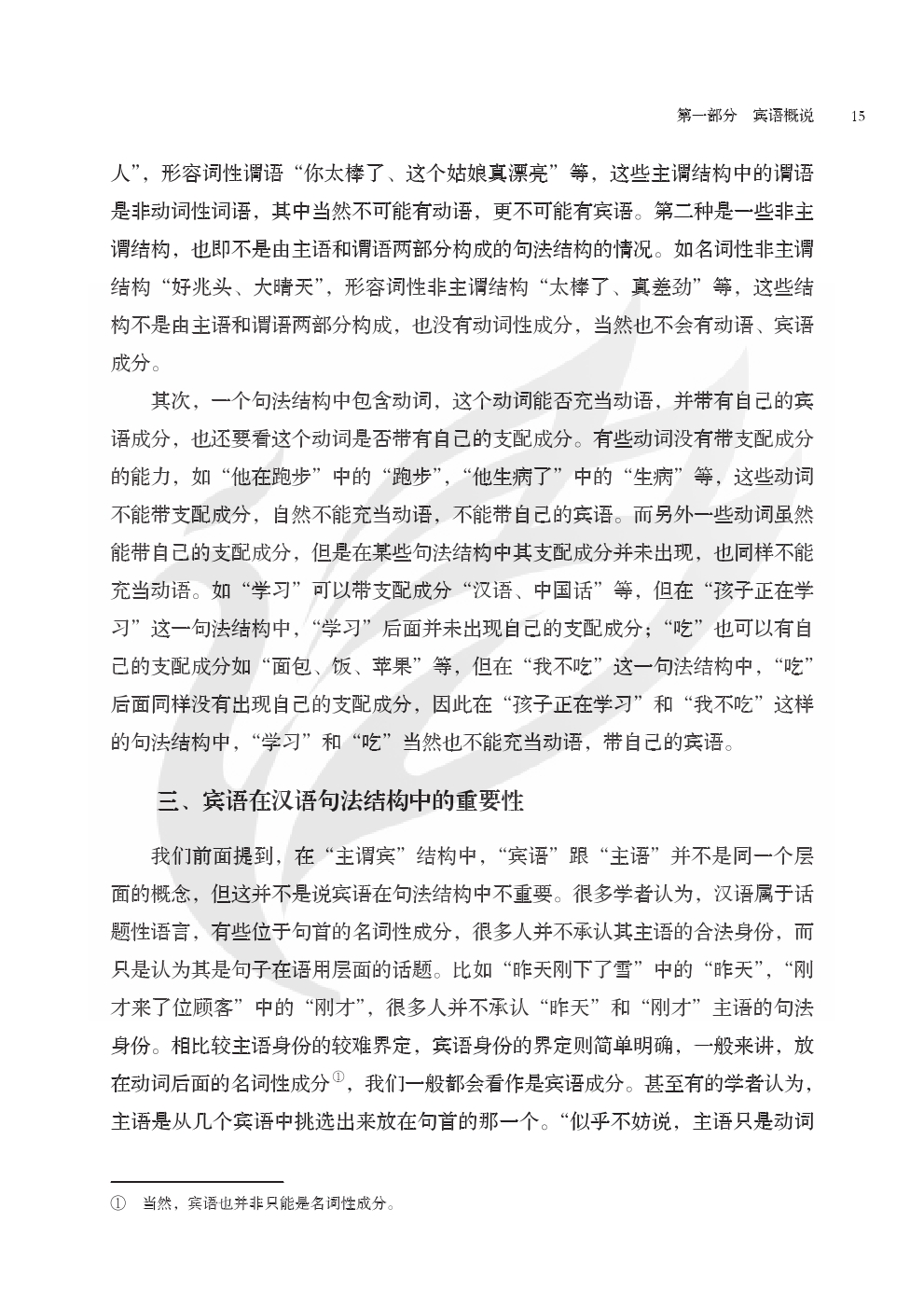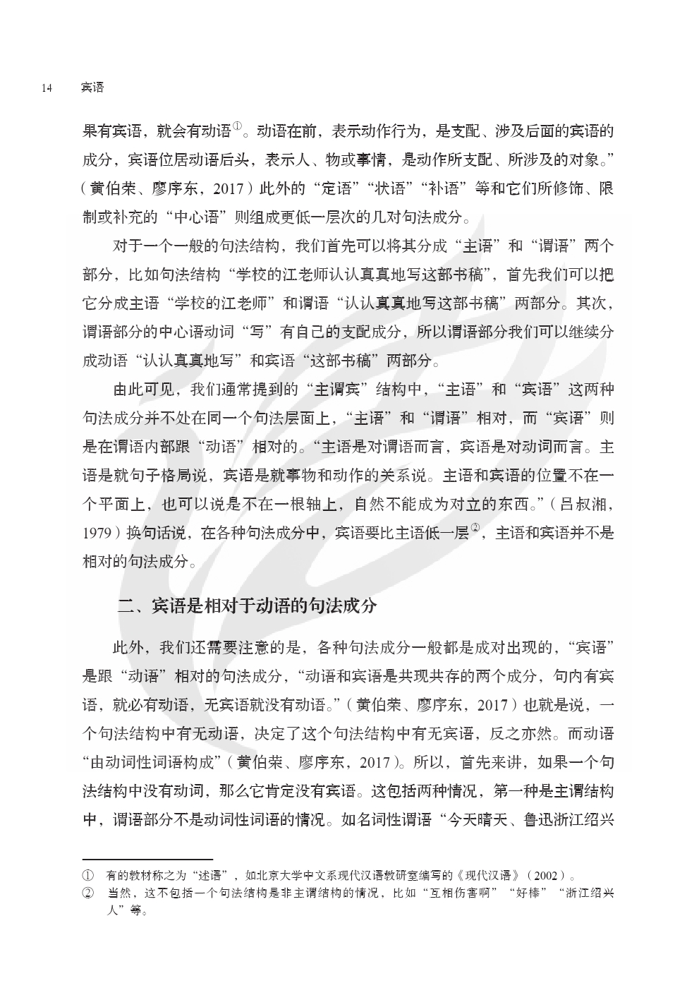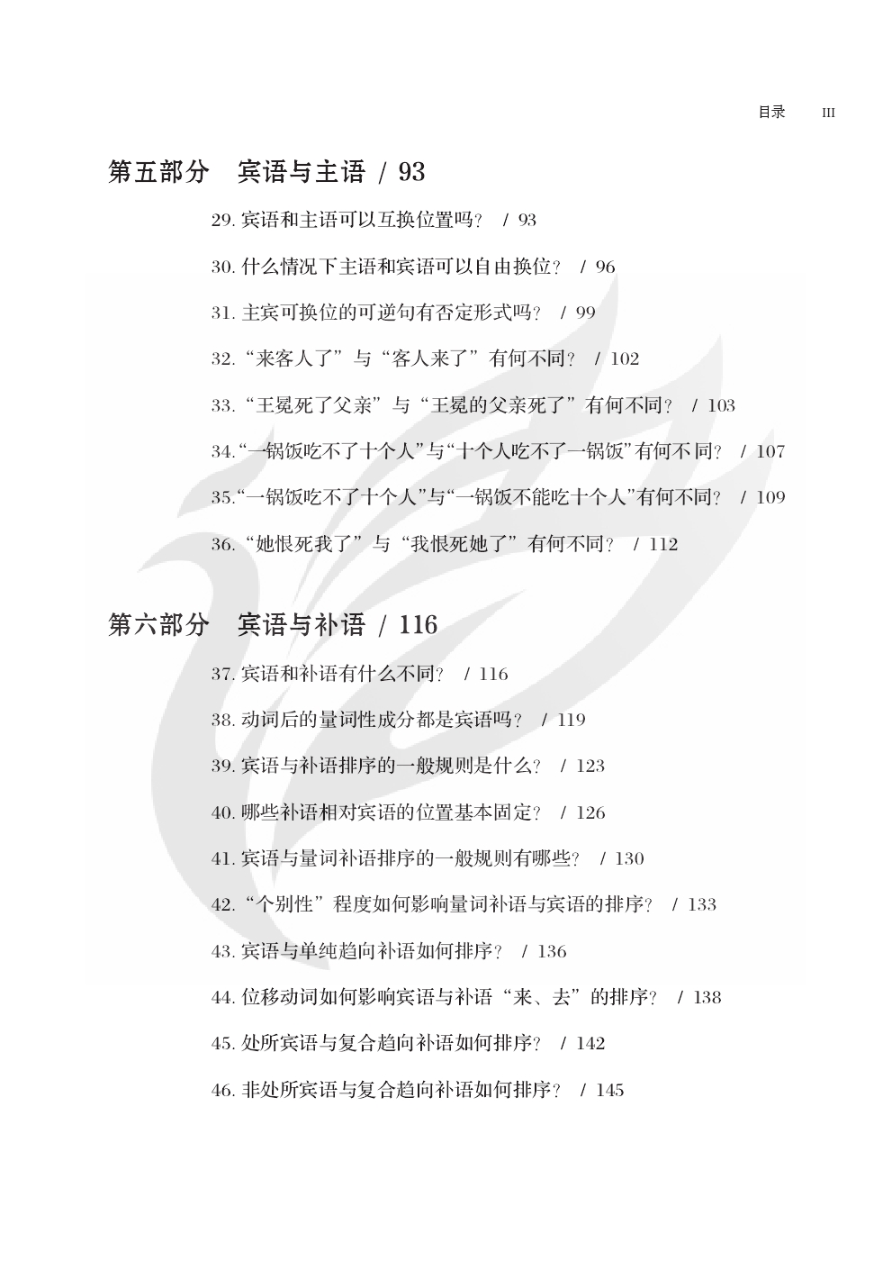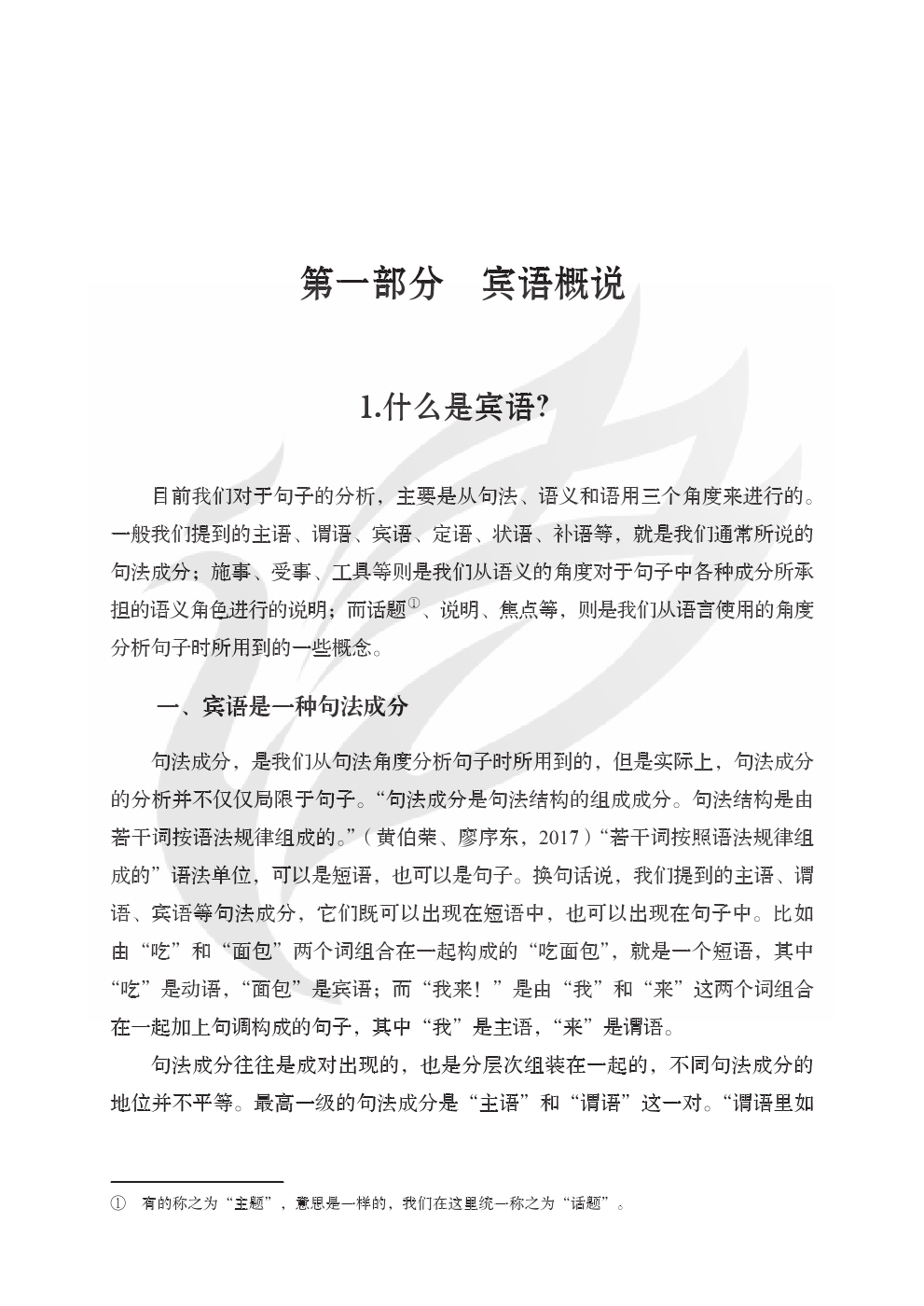 The traditional syntax puts “subject-predicate-object” together which shows the importance of the object as a syntactic constituent. It can be perceived as an important issue in the study of teaching Chinese as a foreign language for its complex semantic identity and uncertain syntactic position. Focusing on the object, this book targets the problems in teaching Chinese as a foreign language from the ontology. This book designs a total of 72 questions, which can be divided into 10 parts, discusses the basic concepts related to the object, the number and invisibility of the object, the relationship between the object and other syntactic constituents such as the subject, as well as the relationship with related syntactic patterns such as “把”-sentence, etc., analyses the causes of some typical object bias problems, and give examples of teaching suggestions for object-related problems.