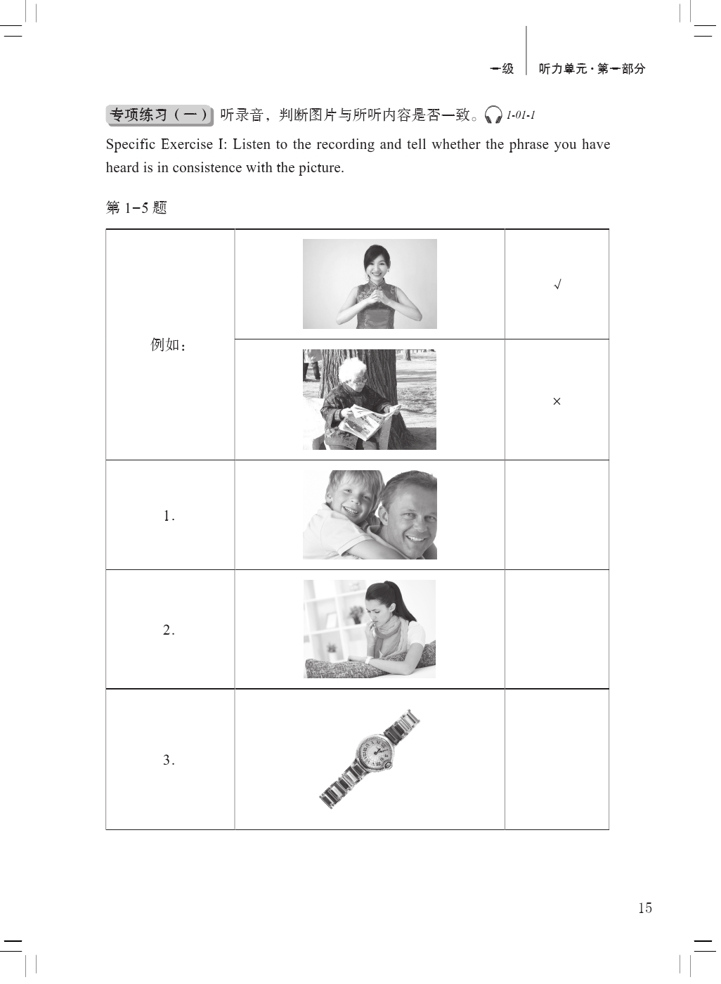 This book is suitable for candidates of HSK (Levels I & II). For the Listening Comprehension and Reading Comprehension tests of HSK (Levels I & II), using examples from the past tests, it summarizes the question type and answering skills, analyses the past exam questions, provides specific exercises and five mock tests. The difficulty of questions is consistent with that of the real ones. All the exercises are provided with answers and all the explanations are annotated in English to facilitate students’ self-learning. An MP3 CD is attached to the book, which includes the recording for the listening comprehension tests in the specific exercises and the mock tests.