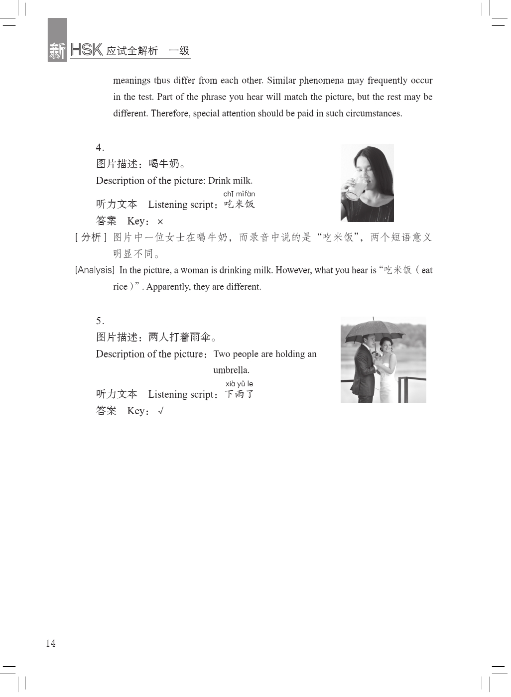 Thorough Analyses of New HSK, a series of textbooks written for New HSK examinees, consisting of five books, namely Thorough Analyses of New HSK for Levels I & II,Thorough Analyses of New HSK for Level III, Thorough Analyses of New HSK for Levels IV, Thorough Analyses of New HSK for Level V and Thorough Analyses of New HSK for Level VI. The compilation style of each book is consistent with the modules of the New HSK. Each part is composed of the Explanation of Question Types, Answering Skills, Important Test Points and Past Test Analysis, and Practice of Specific Language Skills. Mock tests are provided at the end for examinees to test themselves. All the exercises and mock tests have Q&A explanations for self-learners or tutorial takers.