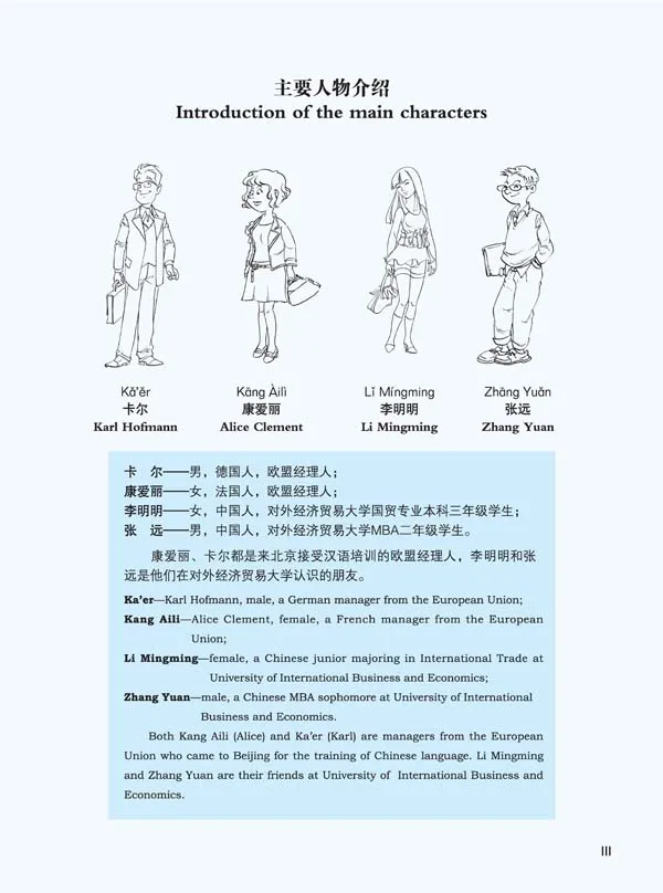 Winning in China—Business Chinese is a series of textbooks specifically written for EU-China Managers Exchange and Training Programme takers and other learners of business Chinese without any Chinese learning experience. The series has three levels in total, among which the basic level includes three textbooks, supplemented by two independent volumes: Pronunciation and Chinese Characters for use at the elementary stage. All the texts are written in business-oriented Chinese and revolve around topics and situations. Among the rich variety of exercises, the task-based ones are particularly authentic, interesting and practical. The books are printed in two colors and are accompanied by audio CDs.